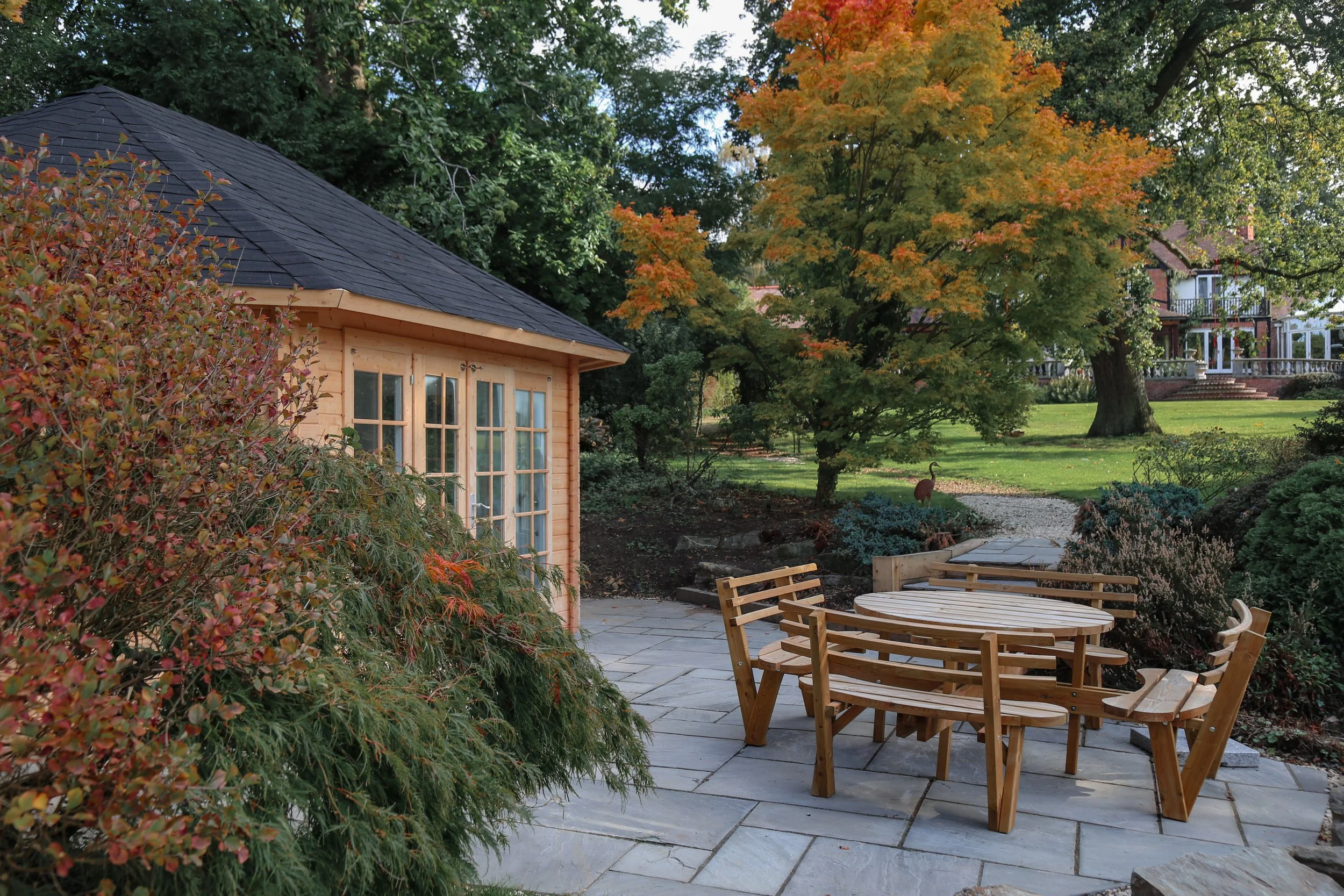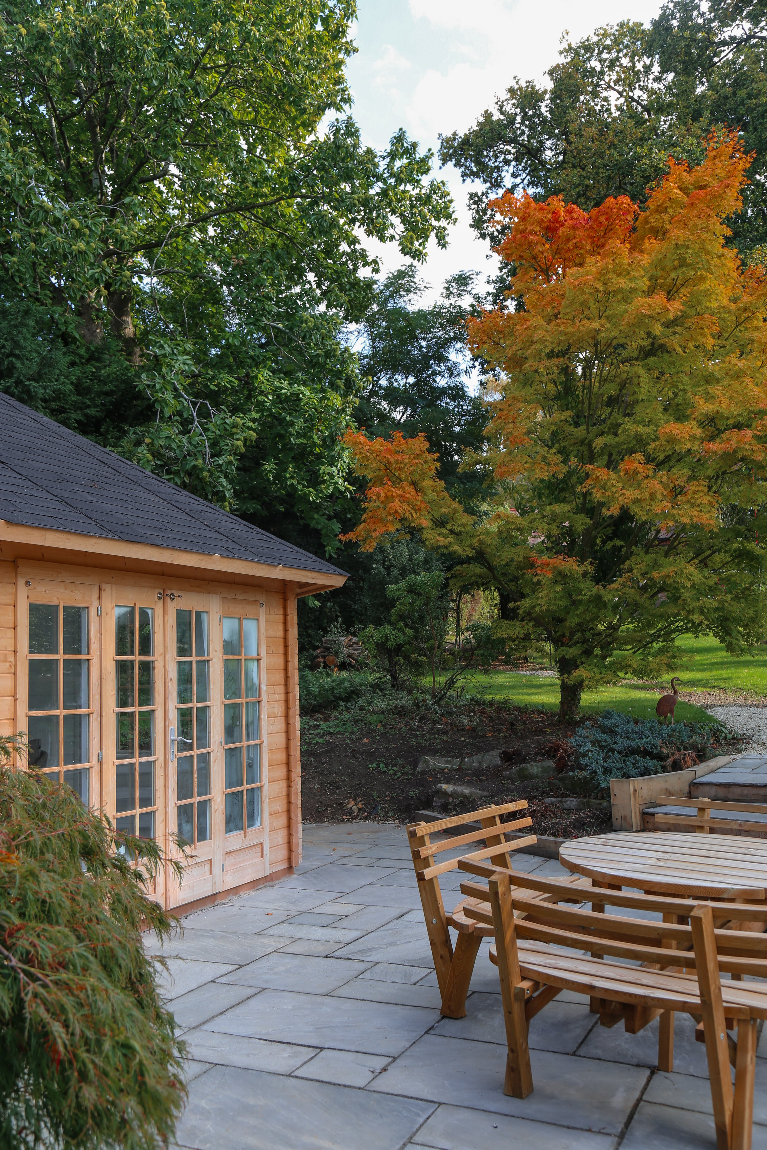 The project began with the construction of a summer-house style garden room featuring a large vaulted ceiling. This was complemented by oak sleeper steps, with all surfaces finished in Kandla Grey sandstone from London Stone. The careful selection of materials ensures that every element sits naturally within its setting, maintaining a cohesive and understated elegance throughout the space.